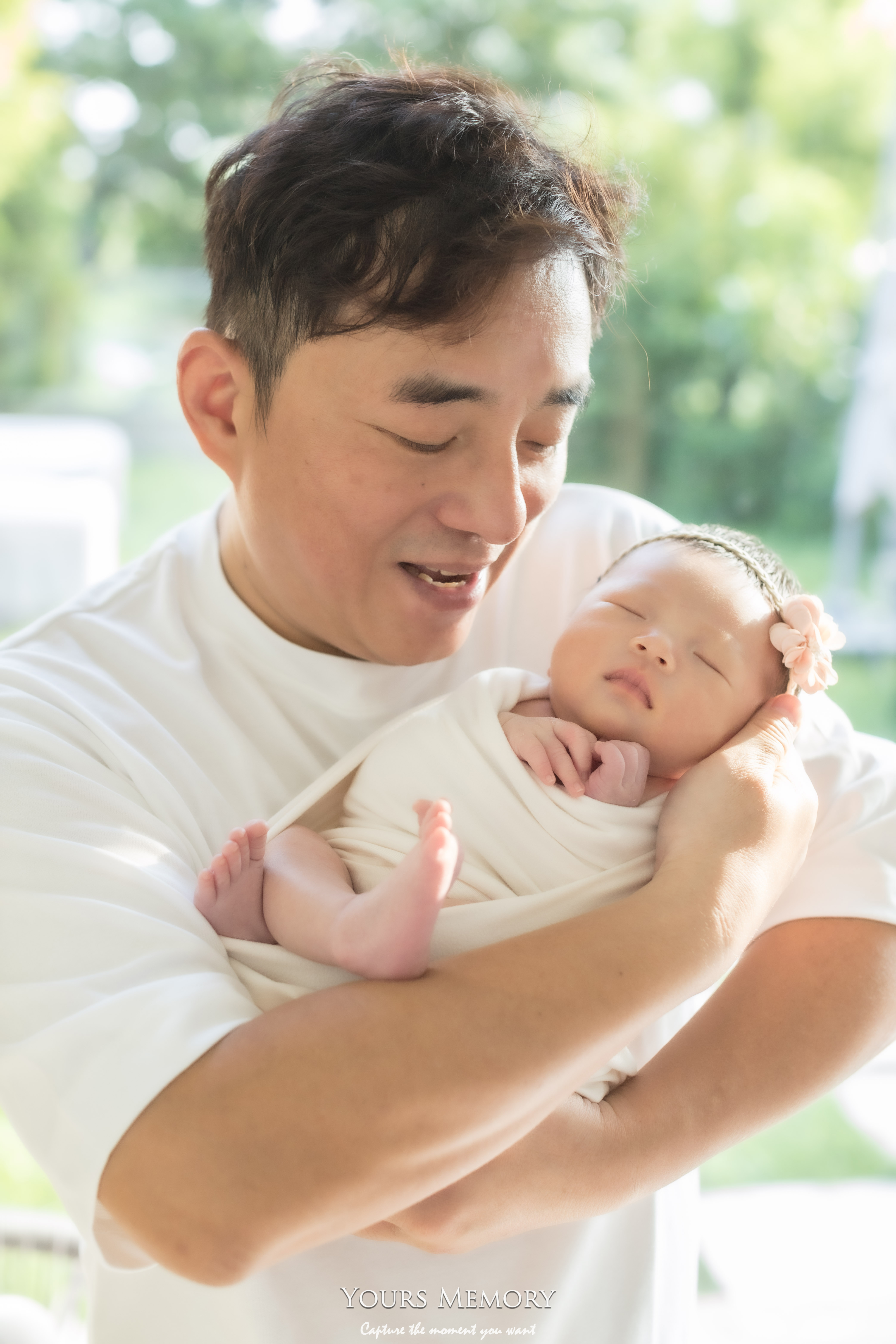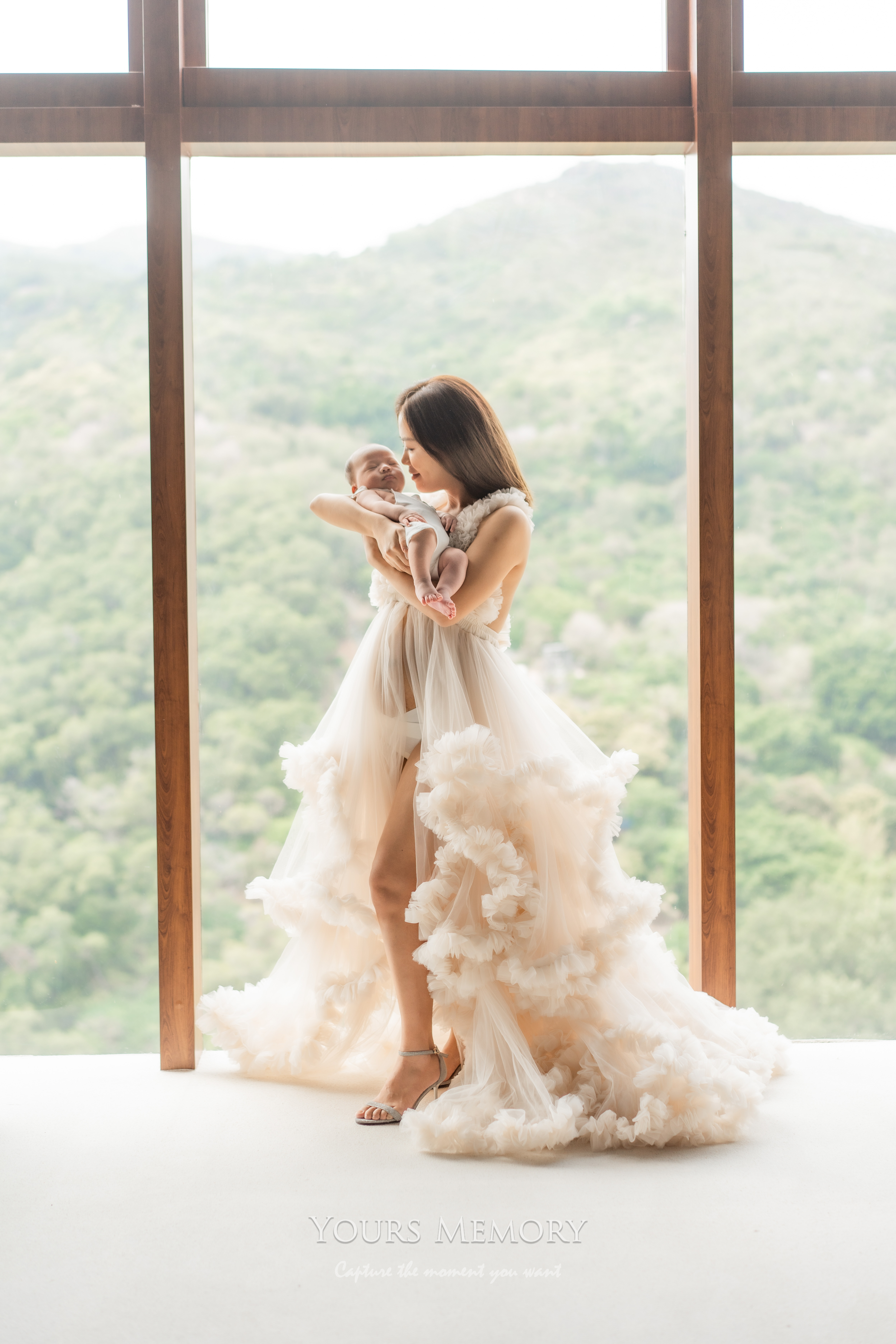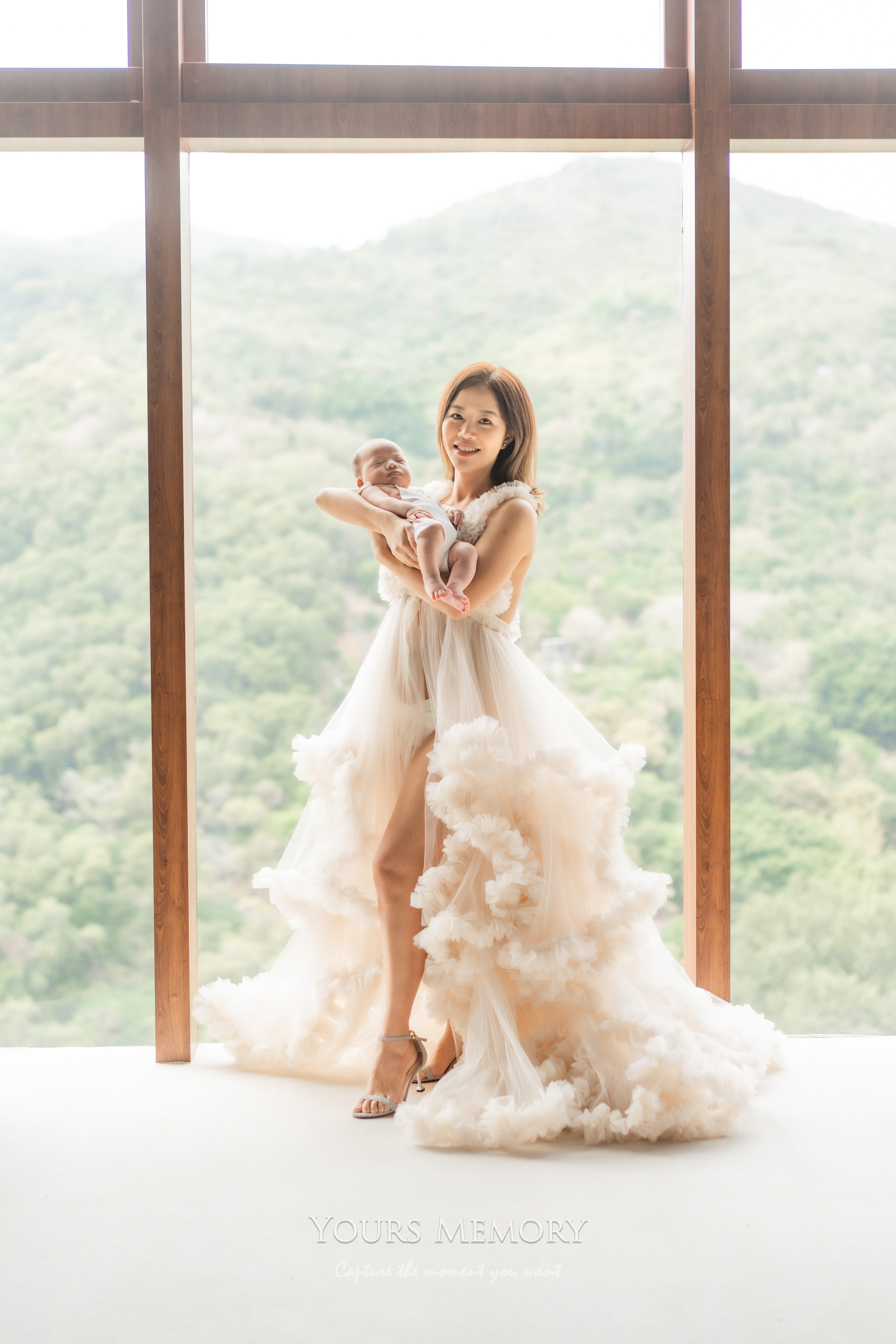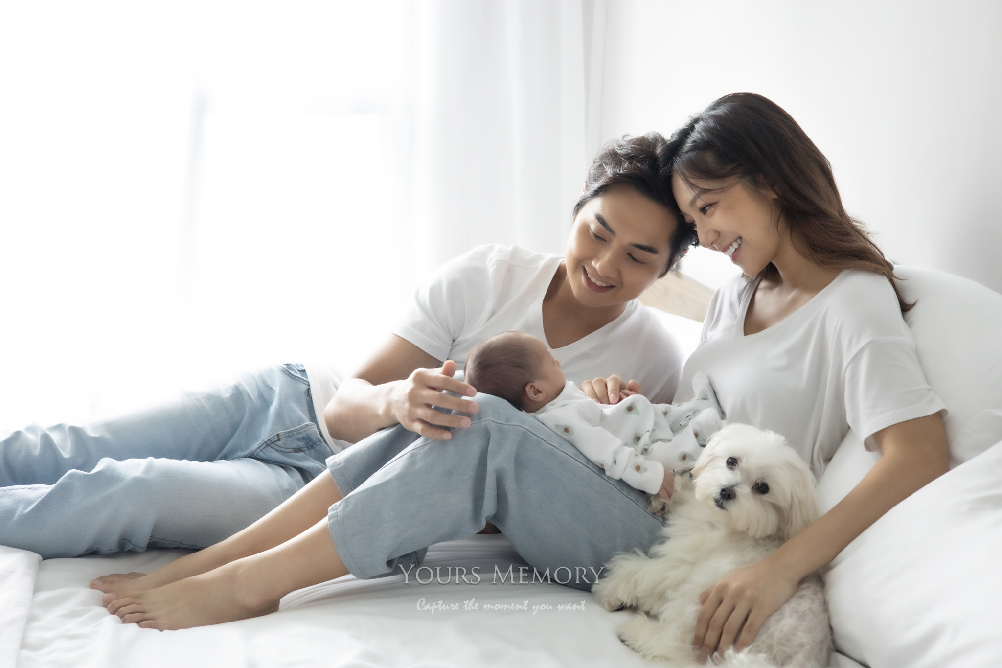 「屋企其實唔算大,本身諗住出影樓,但生完實在太攰。好彩揀咗 YM 上門,佢哋只需要一張床嘅位就佈置到好靚嘅場景,即日收到原相全家人都睇得好開心!」
